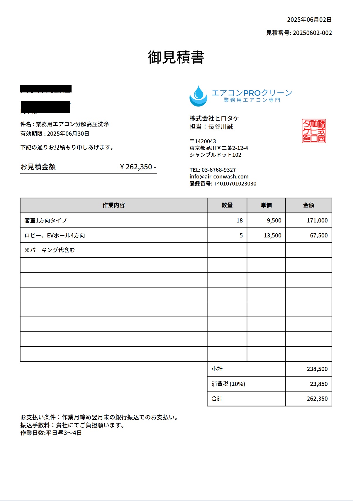 ・作業月:2025年6月 ・現地調査:あり ・洗浄台数:23台 ・作業日数:3日 ・作業人員:1.5 ・作業時間帯:日中