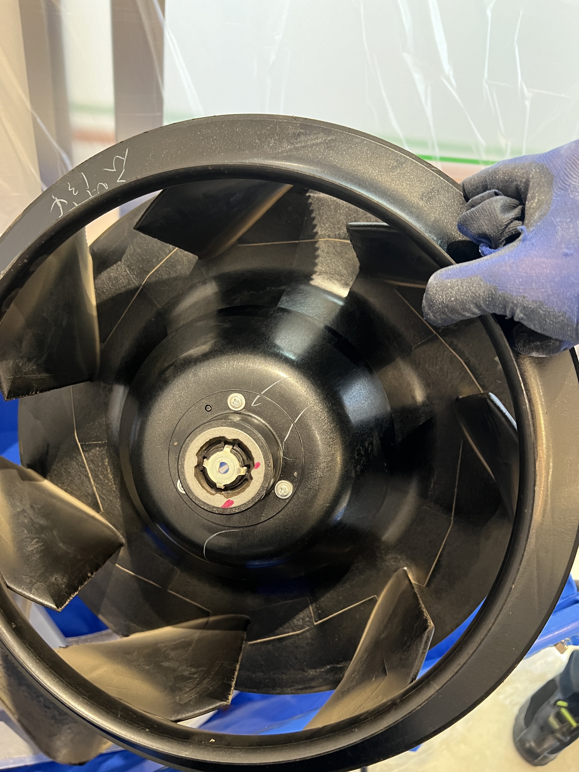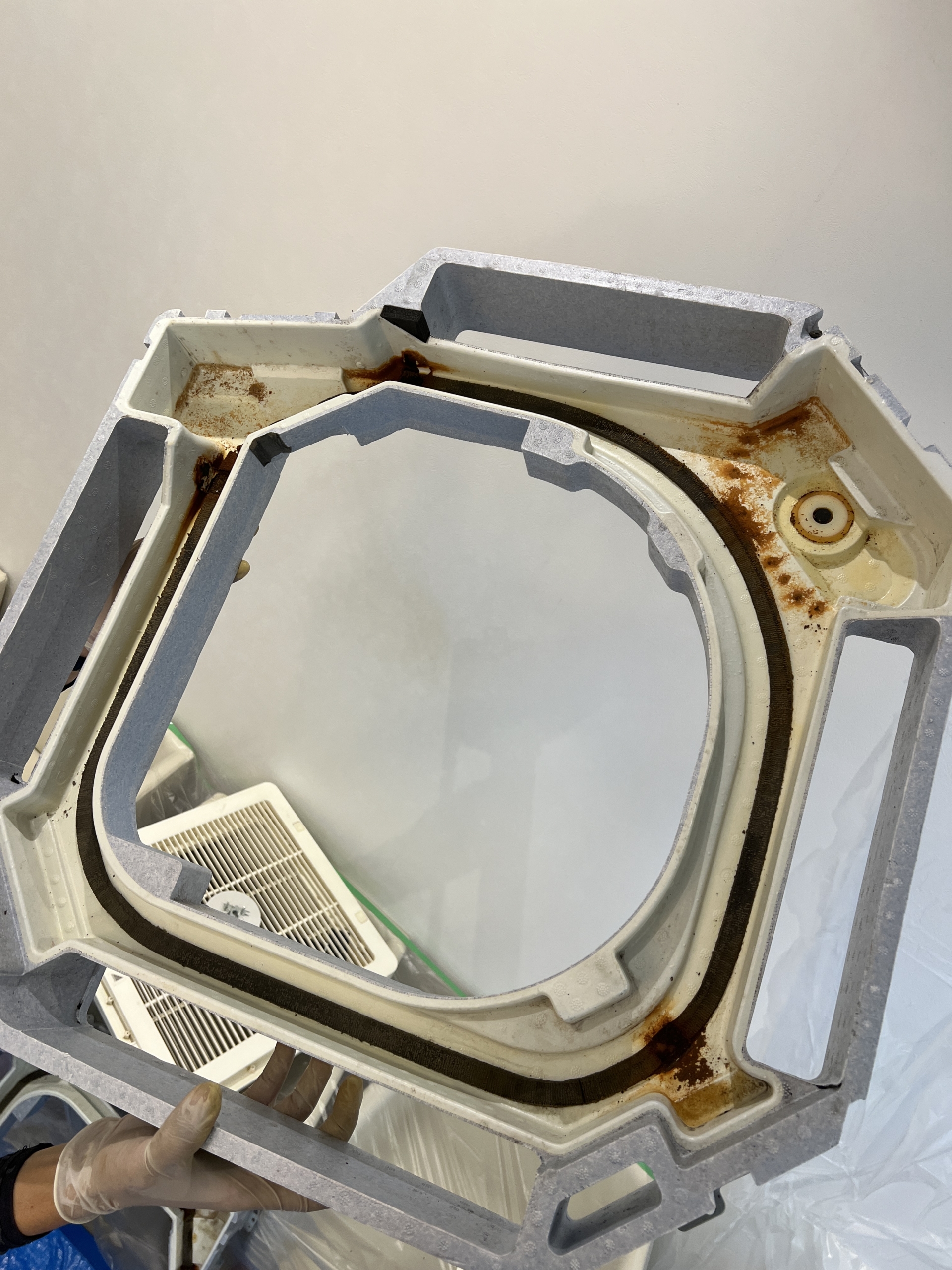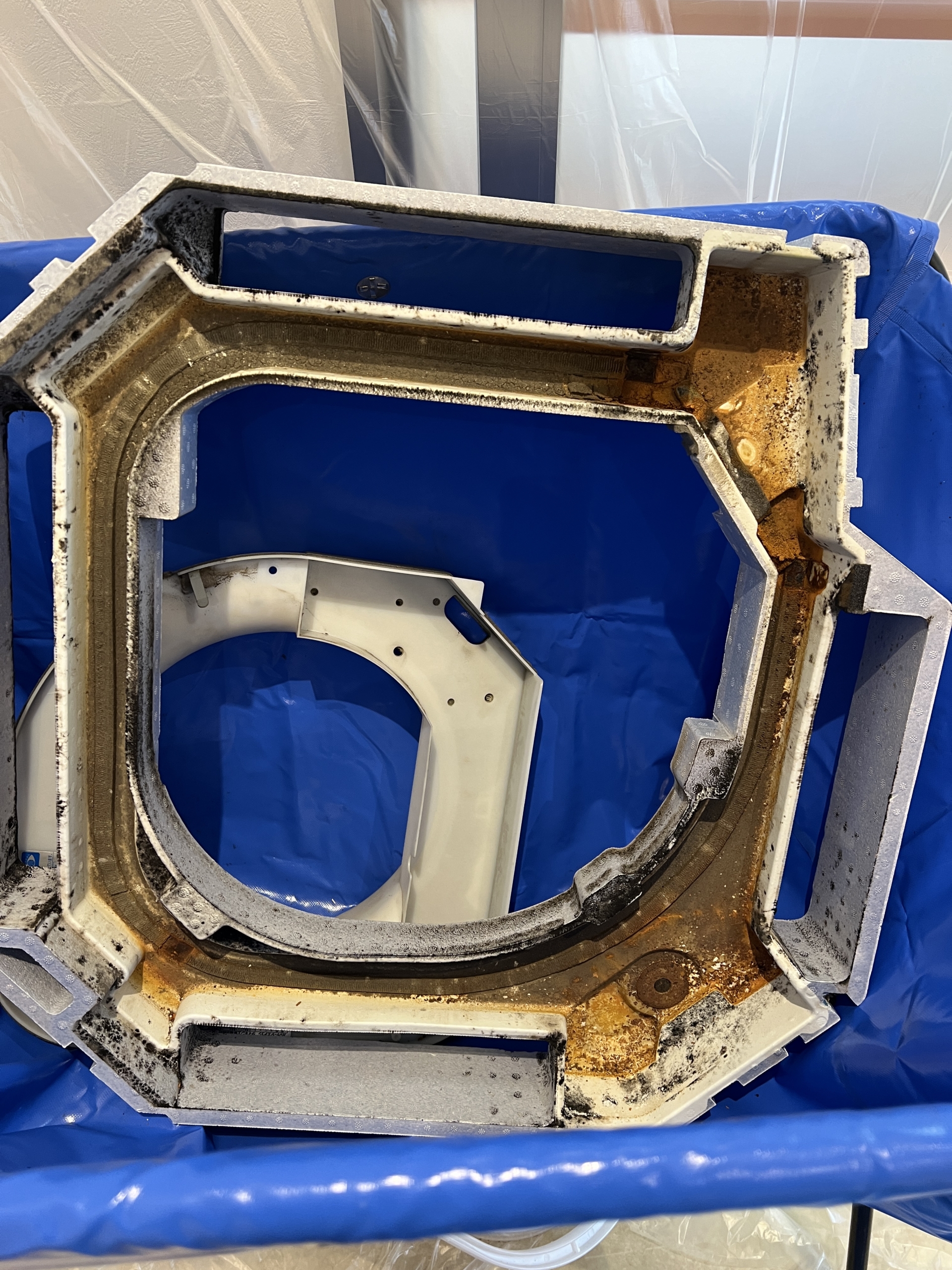 吹き出し口付近や、熱交換器部部のカビが特に多く堆積しておりました。 作業は休診日の午前中に作業を行いました。 パーッ等の洗浄スペースが無い為、洗浄槽を持ち込み待合室でのパーツ洗浄を行いました。
